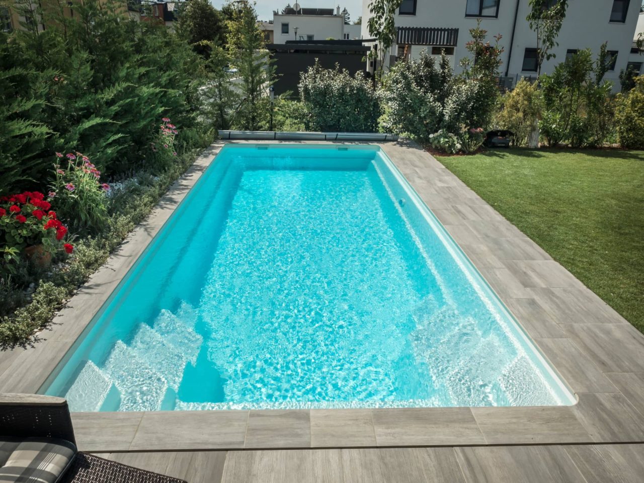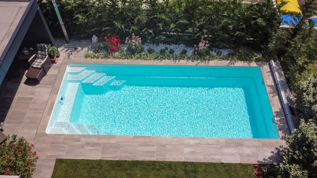 En omtyckt pool med helgaveltrappa, den generösa sittbänken mellan trappstegen gör att poolen behåller mycket av sin simlängd, en genomtänkt trapplösning. Poolen finns i fyra olika storlekar och går att få i många olika färger. Pooltak POPP Perfekt eller P9 ingår.
